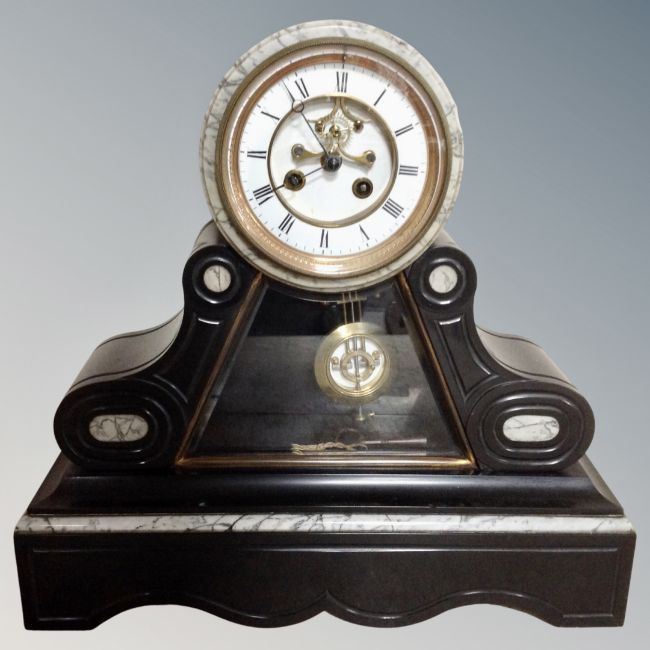 A Victorian black slate and marble drum head mantel clock with pendulum and key
