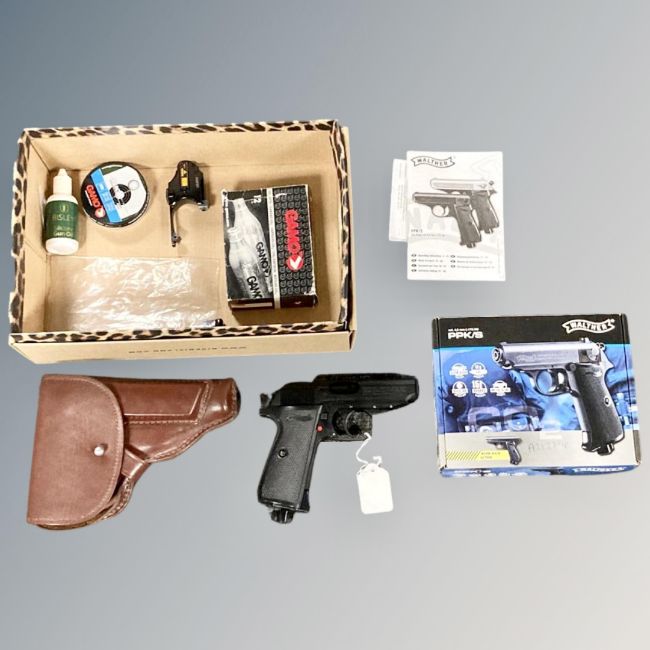 A Umarex Walther PPK/S CO2 powered .177 air pistol with brown leather holster, laser sight and accessories.