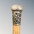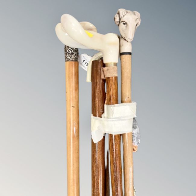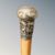 An antique walking cane with white metal cap, probably Chinese silver indistinctly marked, together with further sticks and parasol.