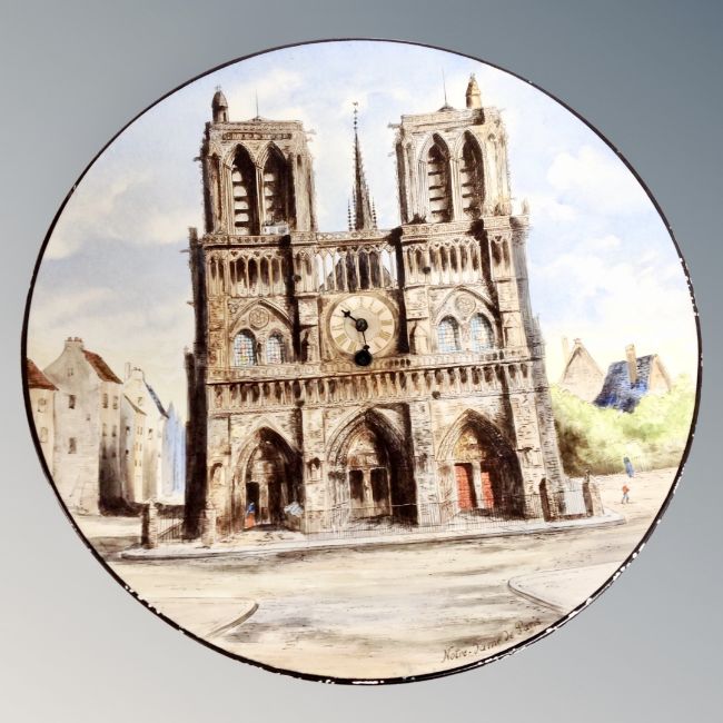 A vintage hand painted ceramic wall plaque / clock depicting Notre Dame