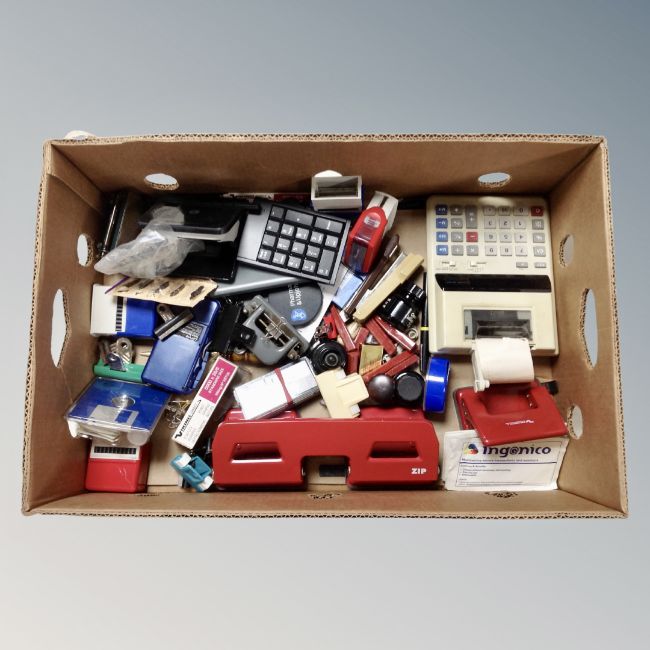 A box of office supplies, electric calculator, hole punch, bottles of ink, staples etc
