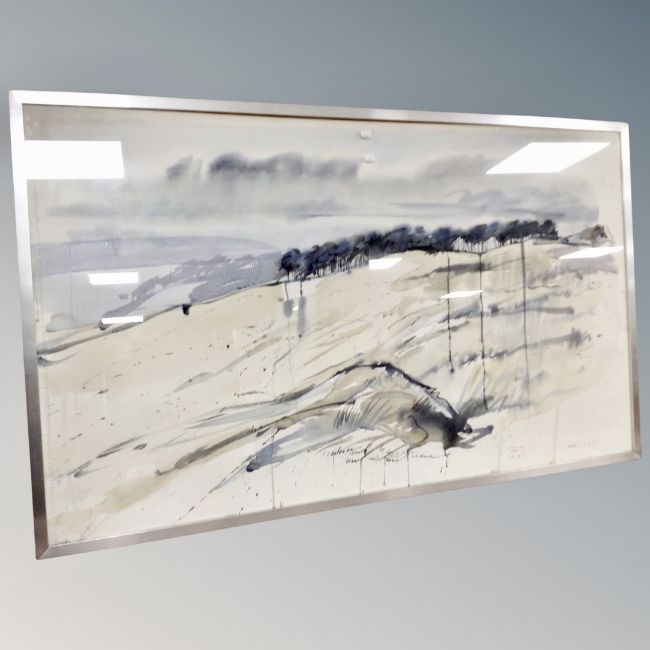 A Derick Doulton watercolour - Hadrians wall, piece 76 site no. 7, presented to Catherine Cookson OBE on the occasion of her 80th Birthday by her friends at Corgi books, framed.