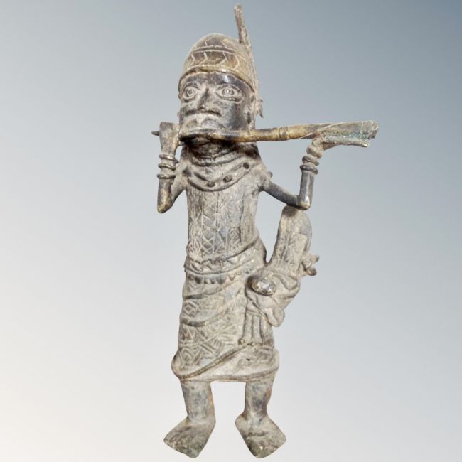 A Benin cast bronze figure - Musician playing a wind instrument, height 40 cm