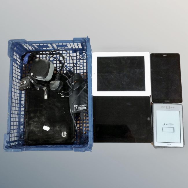 A basket of two Apple iPad 16GB, Huawai tablet, HP mini lap top kindle