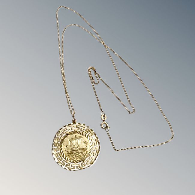 An 18ct yellow gold pendant with Greek style decoration suspended on 18ct yellow gold chain, 8.2g.