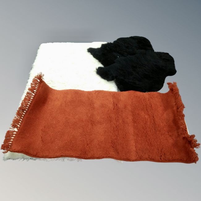 A contemporary cream shaggy pile rug 175 cm x 100 cm together with three further smaller rugs
