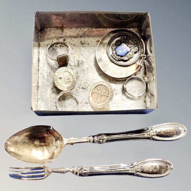 A collection of white metal and silver items to include rings, enamelled fob, fork and spoon etc