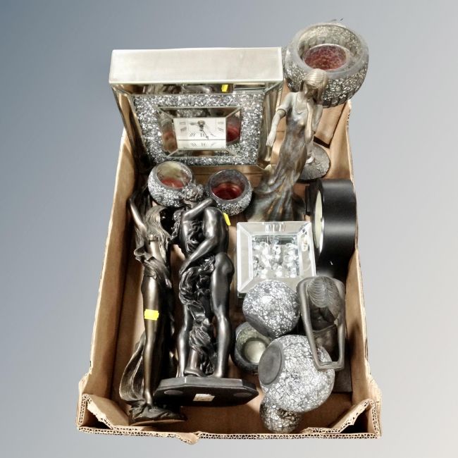 A box of contemporary figures, mirrored wall clock, table box, tea light holders etc