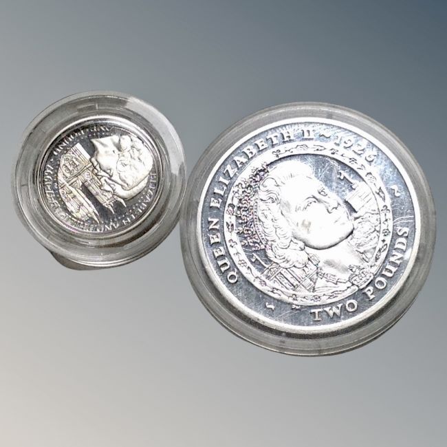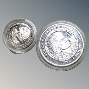 A silver Queen Elizabeth II £2 coin, together with silver 1997 Guernsey £1 coin.