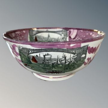 A Sunderland lustre ware bowl : New Bridge Over The Wear at Sunderland, height 12 cm, diameter 26 cm.