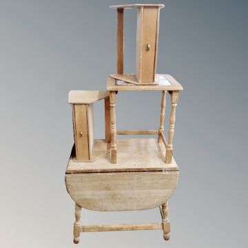 A light oak drop leaf table, two wall shelves and a tiled table