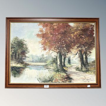 A contemporary oil on canvas of a stream by a woodland track, signed Russet