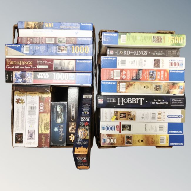 Two boxes containing a quantity of jigsaws relating to Lord of the Rings, Harry Potter.