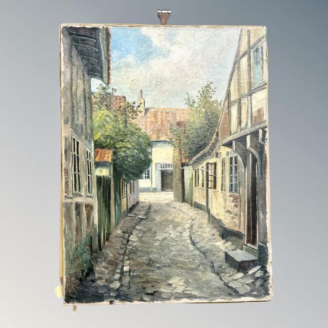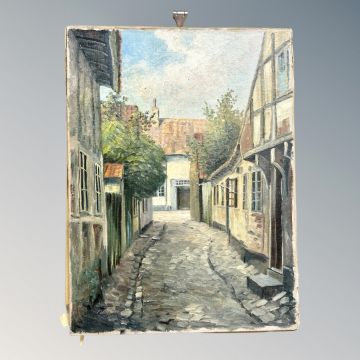 Continental School : A cobbled street, oil on canvas, 59 cm x 44 cm unframed.