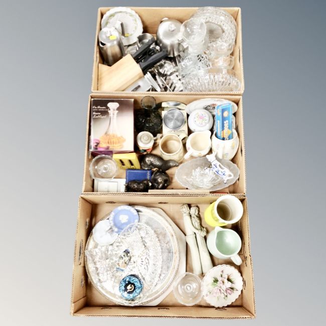 Three boxes of stainless steel kitchen items, glass, ceramics, Carlton ware vase, gallery tray.