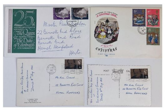 Collection of 1st day issue stamps 1965 - 1970 and a 1980's collectors pack. Two 1965 Winston Churchill first day commemoration issue stamps, 1970 first day of issue postmark, and stamps for Charles Dickens - A Christmas carol, First day cover of the 25th wedding anniversary of Her Majesty The Queen and a mint 1980 commemorative stamps collectors pack.