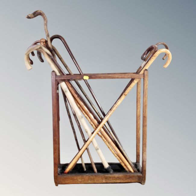 An Edwardian oak stick stand with lift out tray together with a quantity of assorted walking sticks, to include one with silver mount.