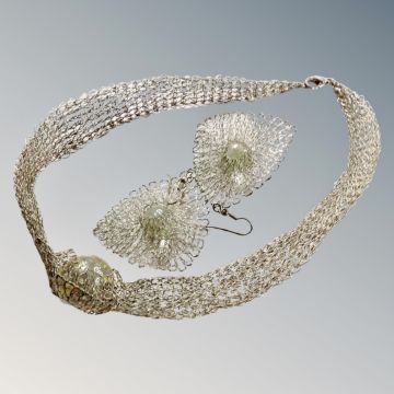 A silver wire mesh necklace and earrings holding iridescent glass balls