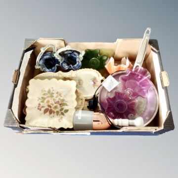 A box of ceramics, Venetian glass baskets, envelope glass etc
