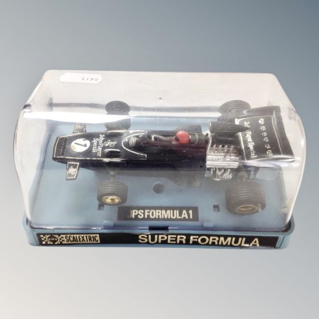 A 20th century Scalextric John Player Special Formula 1 car in plastic display box.