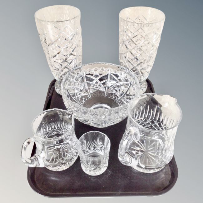 Two Edinburgh Crystal graduated jugs, pair of good quality crystal vases, fruit bowl and whiskey tumbler