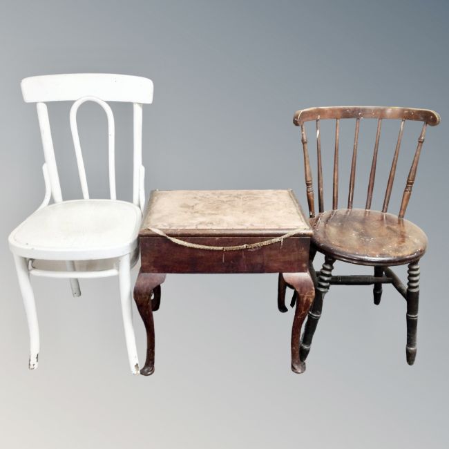 A 20th century storage piano stool together with a bentwood chair and further kitchen chair