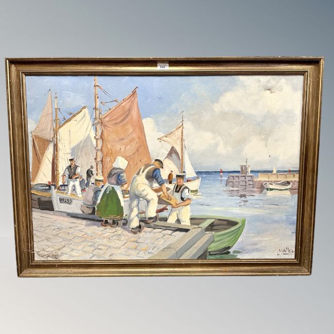 Continental School : Fishermen unloading the catch, oil on canvas, 95 cm x 66 cm