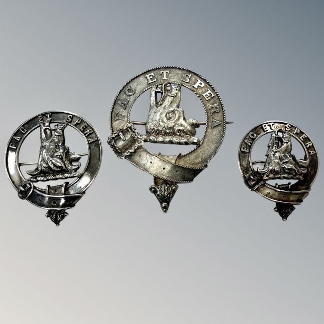 Three antique silver clan badges marked Fac et Spera ('Do and Hope')