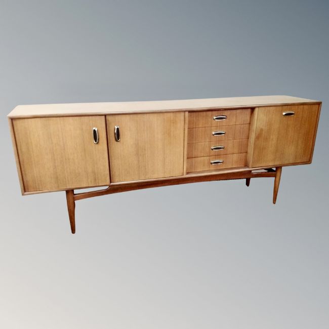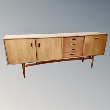 A mid century teak G-plan low sideboard fitted with drawers and cocktail unit