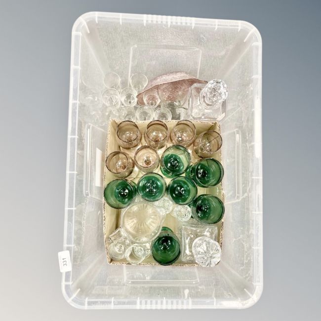A box of green and pink wine glasses, six Edwardian Greek key pattern glasses, decanters ets