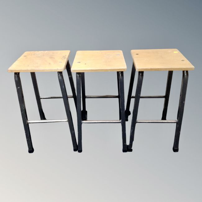 A set of three 20th century plywood topped laboratory stools on metal legs