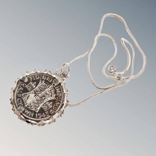 A 1945 half crown in silver mount on chain.