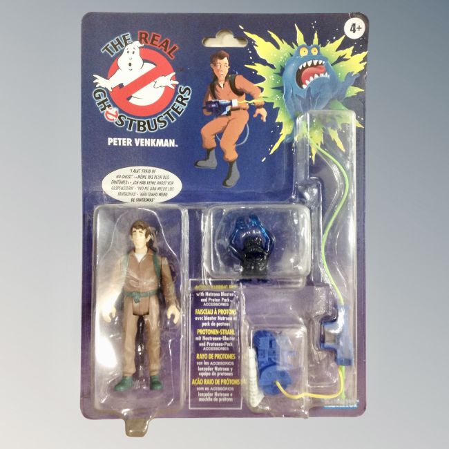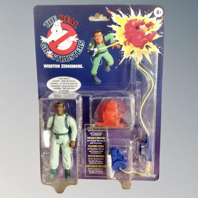 A set of six Kenner toys The Real Ghostbusters figures, Ray Stentz, Winston Zeddemore, Peter Venkman, Egon Spengler, Stay Puft Marshmallowman and Green Ghost Slimer, all in original packaging.