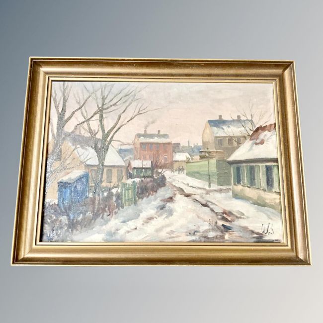 Danish School : Snow in street scene, oil on canvas, initialled WB, 47 cm x 66 cm.