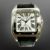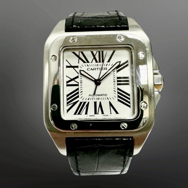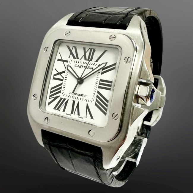 Cartier Santos 100 stainless steel automatic wristwatch, white dial with Roman numerals, centre seconds and secret signature at 7 o' clock, synthetic sapphire cabochon-set crown, black leather strap with Cartier steel deploying clasp, case 40mm.