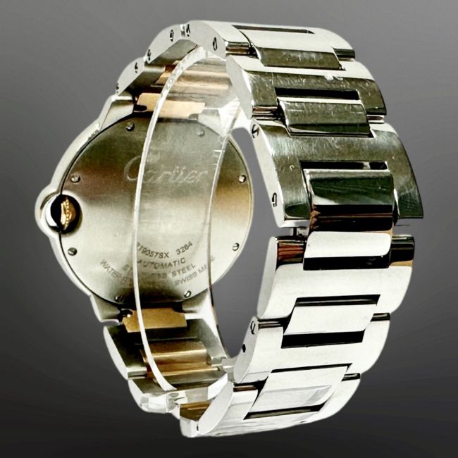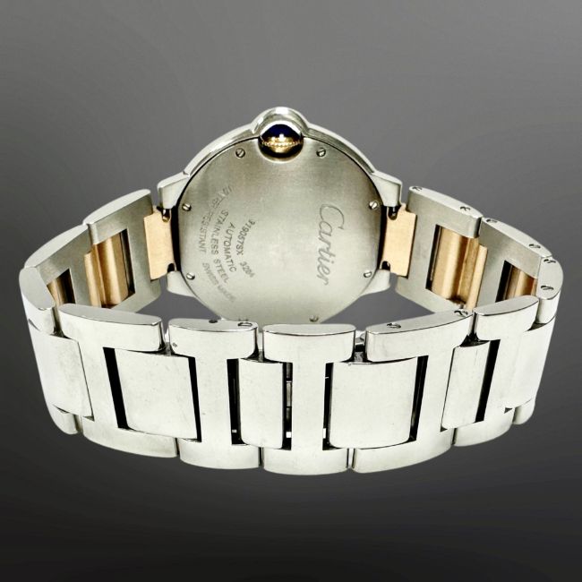 Cartier Ballon Bleu stainless steel and 18ct rose gold automatic wristwatch, pink mother of pearl dial with Roman numerals, centre seconds and secret signature at 7 o' clock, synthetic sapphire cabochon-set crown, Cartier steel and gold bracelet with deploying clasp, case 36mm.