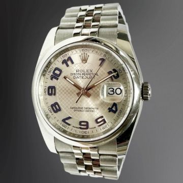 Rolex Gent's Datejust stainless steel automatic calendar wristwatch, Ref. 116200, silvered and textured dial with Arabic numerals, centre seconds and date aperture at 3 o' clock, outer minute track, Rolex crown, Rolex stainless steel Jubilee bracelet with deploying clasp, case 36mm.