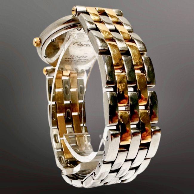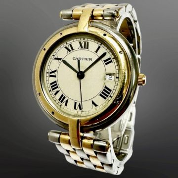 Cartier Cougar 18ct gold and stainless steel quartz calendar wristwatch, silvered dial with Arabic numerals, centre seconds, date aperture at 3 o' clock, Cartier steel and gold bracelet with deploying clasp, case 29mm.