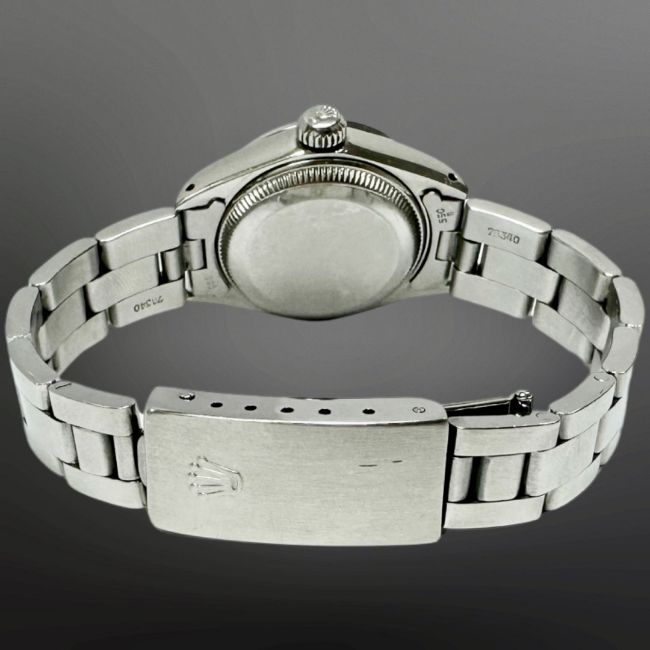 Rolex Lady's Datejust stainless steel diamond-set automatic calendar wristwatch, mother of pearl dial with diamond numerals, date aperture at 3 o' clock, centre seconds, diamond-set bezel, Rolex crown, Rolex steel oyster bracelet with deploying clasp, case 26mm.
