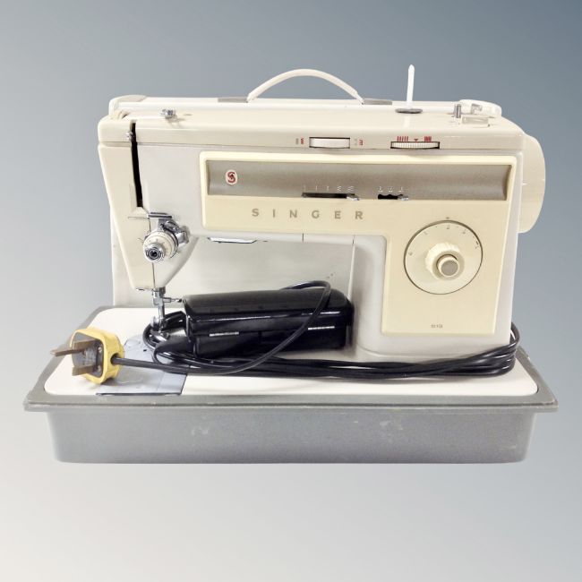 A Singer 513 electric sewing machine with foot pedal in case.