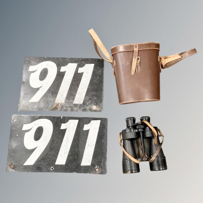 A pair of Ross Binoculars 7 x 50 Steplux together with two metal 911 plates. (3)