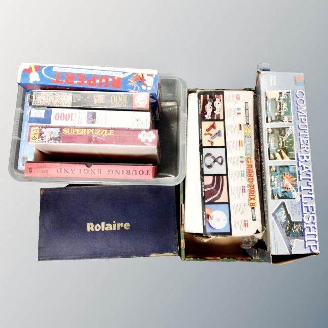 Two boxes containing board games, jigsaws, Scalextric Grand Prix 8 together with a MB computer battleship game.