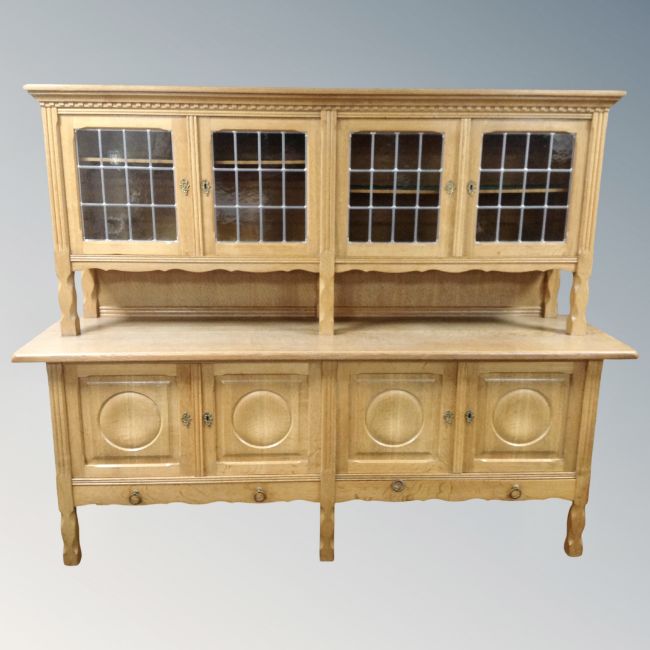 A Danish blonde oak four door leaded glass buffet back sideboard, fitted cupboards and drawers beneath, 200cm by 51cm by 159cm