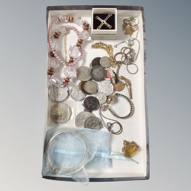 A box containing antique and later coins, swivel fob, ladies wrist watch, necklaces.