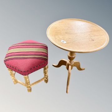 A Danish blonde oak wine table on three-way pedestal together with a blonde oak hexagonal foot stool.