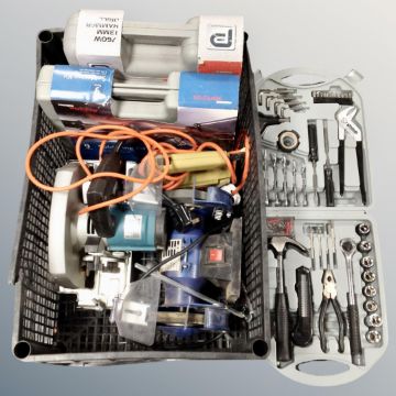A crate containing cased and uncased power tools to include performance hammer drill, soldering kits, jig saws, circular saw together with a bench top grinder.
