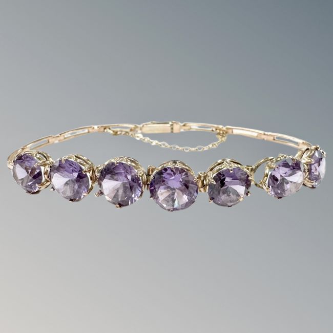 A gold and amethyst bracelet, the seven amethysts in raised claw settings, on segmented links with safety chain.