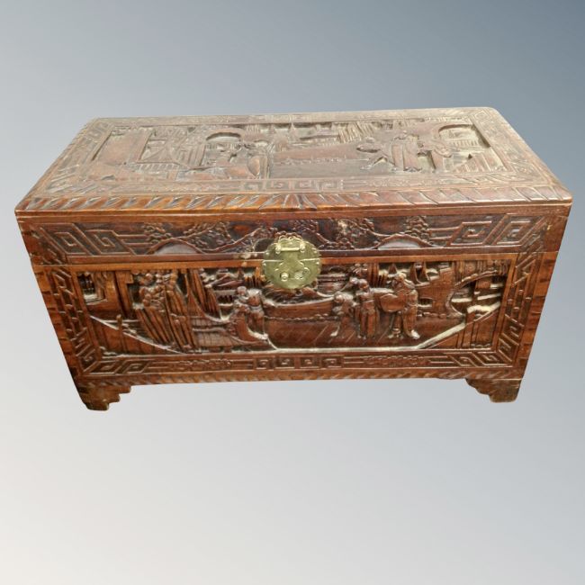 A heavily carved camphor wood box, 89cm by 44cm by 48cm