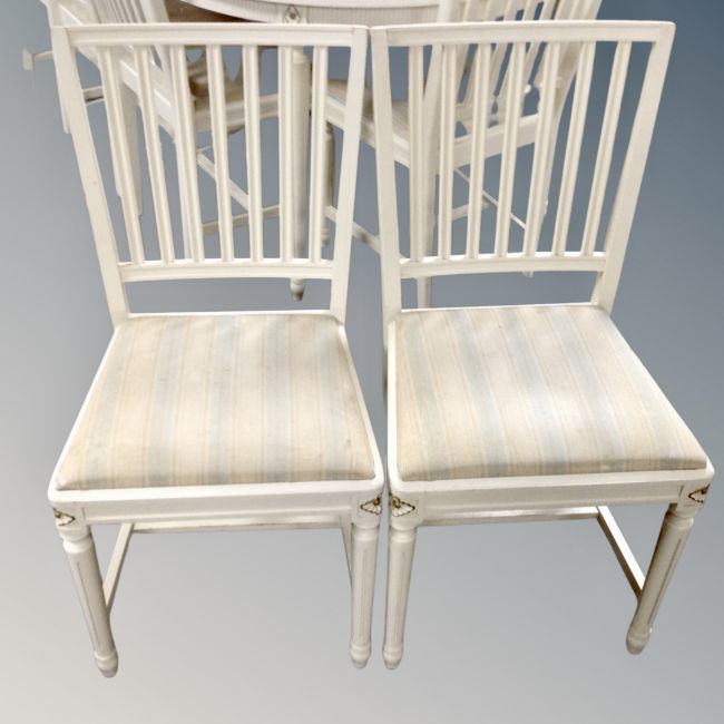 A Danish circular extending dining table with three leaves together with a set eight rail back chairs