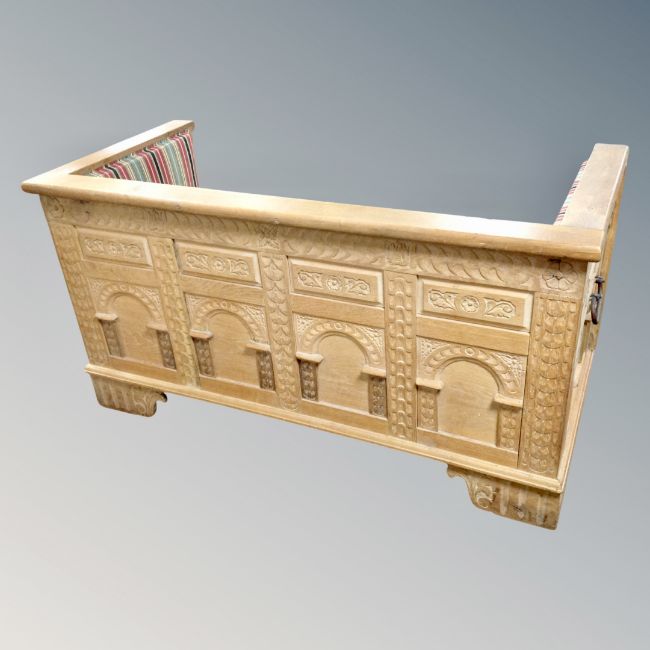 An early 20th century Danish heavily carved oak framed hall settee upholstered in a striped fabric, 147cm by 75cm by 78cm